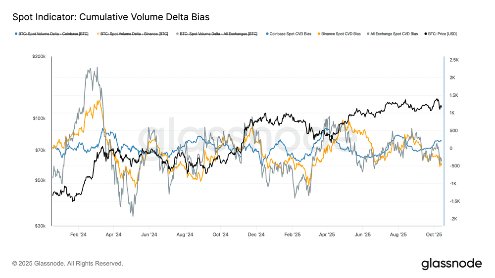 اگر جهش حجم معاملات اسپات را با داده‌های شاخص دلتای حجم تجمعی (CVDB) – که انحراف حجم معاملات بازار را نسبت به میانگین ۹۰ روزه آن اندازه‌گیری می‌کند – ترکیب کنیم، متوجه می‌شویم که یک واگرایی قابل‌توجه در فعالیت معاملاتی صرافی‌های بزرگ ارز دیجیتال ایجاد شده است. در حالی که صرافی بایننس با فشار فروش شدید از سوی سفارش‌بردارها (Takers) مواجه بود، در کوین بیس فقط فعالیت خرید رخ داده است. این نشان می‌دهد که سرمایه‌گذاران نهادی آمریکا در حال جذب عرضه بوده‌اند.