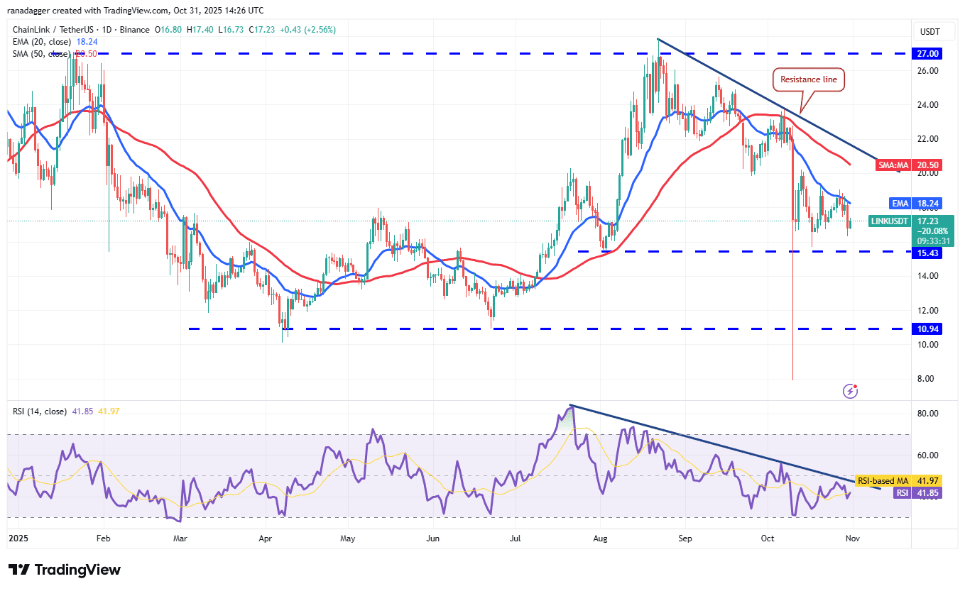 میانگینهای متحرک نزولی شدهاند و شاخص قدرت نسبی در محدوده منفی قرار دارد. این امر نشان میدهد که فروشندگان کنترل بازار را در دست دارند. قیمت LINK میتواند سپس تا حمایت ۱۵.۴۳ دلار سقوط کند، جایی که انتظار میرود خریداران وارد عمل شوند.