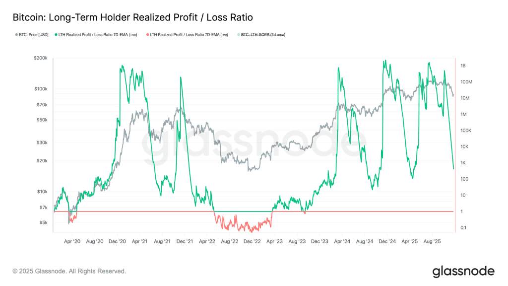 در اوایل ماه اکتبر (اواسط مهر)، شاخص نسبت سود/ضرر تحققیافته سرمایهگذاران از محدوده خنثی (۴.۳ برابر) پایینتر رفت و حالا به نزدیکی سطح ۰.۰۷ برابر سقوط کرده است. این وضعیت که غلبه گسترده ضرر تحققیافته بر بازار را نشان میدهد، بیانگر این است که نقدینگی به حداقل خود رسیده است. این شرایط نتیجه فروش گسترده از سمت هولدرهای بلندمدت است که در دورههای پرتقاضا، یعنی سهماهه دوم و سوم سال ۲۰۲۵ رخ داد.