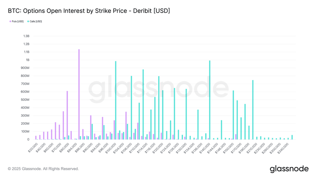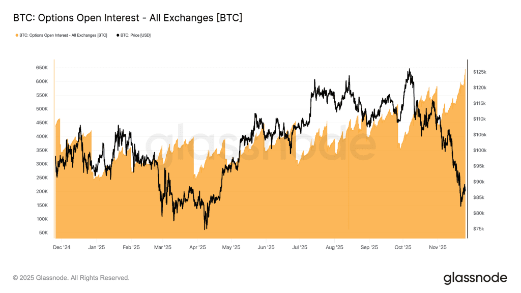 در نتیجه افزایش نوسانات قیمت بیت کوین، فعالیت معاملهگران در بازار آپشن نیز افزایش یافت. ترکیب استراتژیهای آربیتراژی و تقاضا برای مدیریت ریسک باعث شد که اوپن اینترست بازار آپشن بیت کوین به اوج تاریخی خود برسد. البته لازم به ذکر است که این رکورد فقط بر مبنای BTC است. از نظر دلاری، اوپن اینترست بازار آپشن هنوز با اوجی که در اواخر ماه اکتبر ثبت شده بود (زمانی که قیمت بیت کوین حدود ۱۱۰,۰۰۰ دلار بود)، فاصله زیادی دارد.