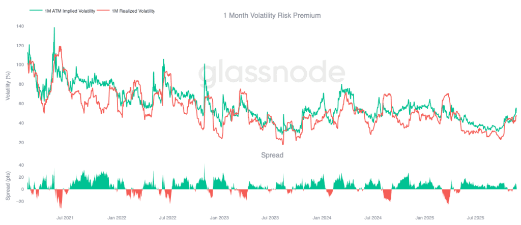 سطح نوسان ضمنی یکماهه همچنان بالا است و آپشنهای بسیار دور از قیمت اعمال (Out-of-the-money) که در اواخر ماه دسامبر منقضی خواهند شد، هنوز با پریمیومهای سنگین معامله میشوند. این وضعیت باعث شده است که فروش نوسان سودآور باشد، چون نوسان ضمنی از نوسانات حقیقی بازار بیشتر است. با این حال ممکن است شرایط بازار بهسرعت تغییر کند. این احتمال وجود دارد که جلسه پیش روی فدرال رزرو یک ریسک رویدادی بر بازار تحمیل کند و این ریسک میتواند نوسانات تحققیافته بیت کوین و وضعیت سودآوری قراردادهای آپشن را بهکلی تغییر دهد.