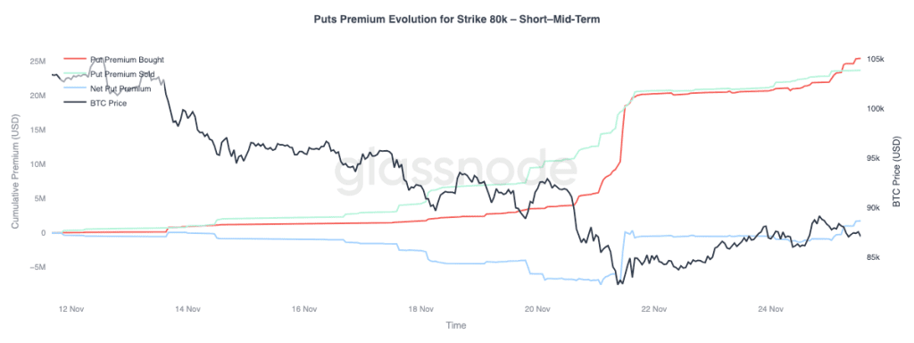 بررسی جریان قراردادهای پوت در اطراف قیمت اعمال ۸۰,۰۰۰ دلار بهخوبی به ما نشان میدهد که تقاضای پوشش ریسک برای سررسیدهای میانمدت و کوتاهمدت چگونه است. همزمان با بازگشت قیمت بیت کوین از سطح ۸۰,۵۰۰ دلار، تقاضا برای قراردادهای پوت در چند روز گذشته ثابت مانده است. این ثبات نشان میدهد که نیاز فوری به پوشش ریسک کوتاهمدت کاهش یافته است و آن تقاضای شدید برای حفظ سرمایه که در زمان سقوط قیمت بیت کوین مشاهده شده بود، با ریکاوری قیمت متوقف شده است.