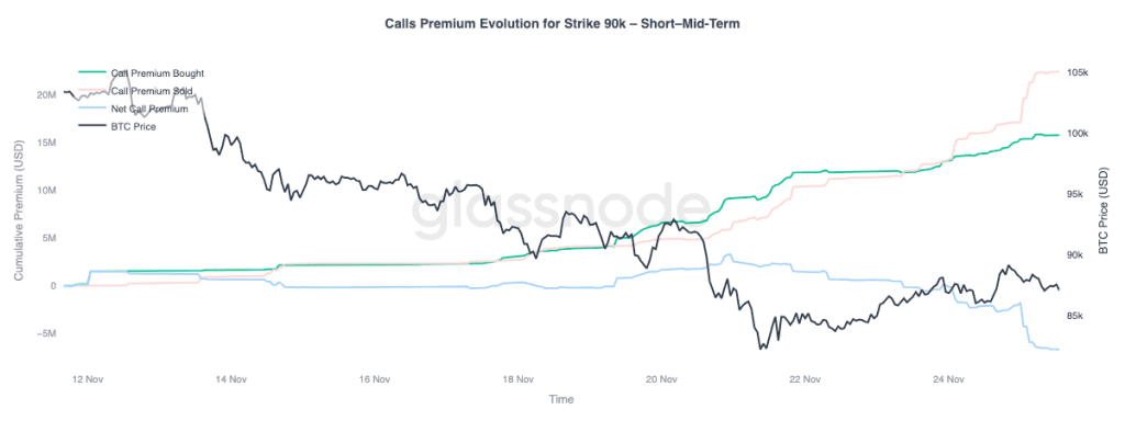 بررسی جریان قرارداد صعودی یا کال، خلاف نتیجهگیری بالا را نشان میدهد. بازار آپشن احتمال سقوط ناگهانی بیت کوین را کم میبیند، اما هنوز به بهبودی و پایداری بازار نیز باور ندارد. بازار بیشتر در تلاش است تا سطح ۹۰,۰۰۰ دلار را پس بگیرد و فعلا آماده بریک اوت یا شکست محدوده مقاومتی خود نیست. این یعنی اعتقاد به رشد قیمت بیت کوین در میان معاملهگران همچنان ضعیف است.