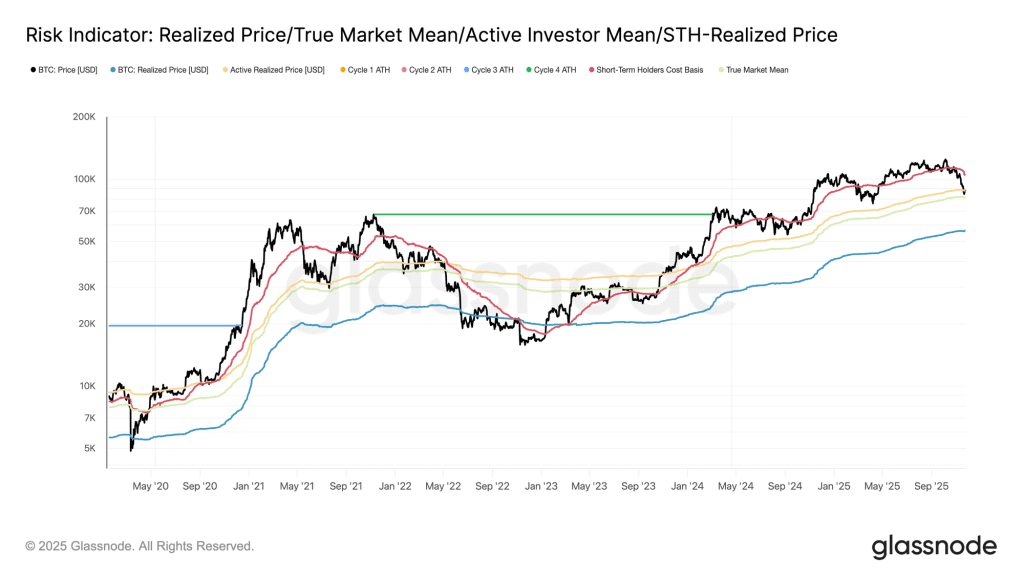 از اوایل اکتبر، بیت کوین زیر قیمت خرید هولدرهای کوتاهمدت (۱۰۴,۶۰۰ دلار) معامله میشود و در این برهه، نقدینگی و تقاضا در بازار بیت کوین بهطور قابلتوجهی کاهش یافته است. در حال حاضر بیت کوین یک محدوده ساختاری مهم را آزمایش میکند که توسط دو سطح کلیدی تعیینشده است؛ محدوده بین قیمت ارزش بازار تحققیافته فعال (Active Realized Cap Price) که قیمت خرید کل بیت کوینهای فعال است و میانگین حقیقی بازار (True Market Mean) که قیمت بیت کوینهای خریداریشده در بازار ثانویه است.