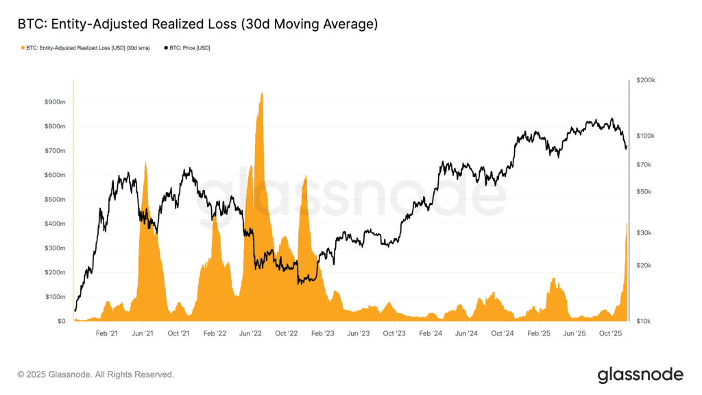 معیار دیگری که بر شباهت وضعیت فعلی بازار با سهماهه اول ۲۰۲۲ تاکید میکند، افزایش ضرر تحققیافته (Realized Loss) سرمایهگذاران است. طبق شاخص میانگین متحرک ۳۰روزه ضرر تحققیافته، ضرر نقدشده توسط سرمایهگذاران بهطور چشمگیری رشد کرده و به ۴۰۳.۴ میلیون دلار در روز رسیده است.