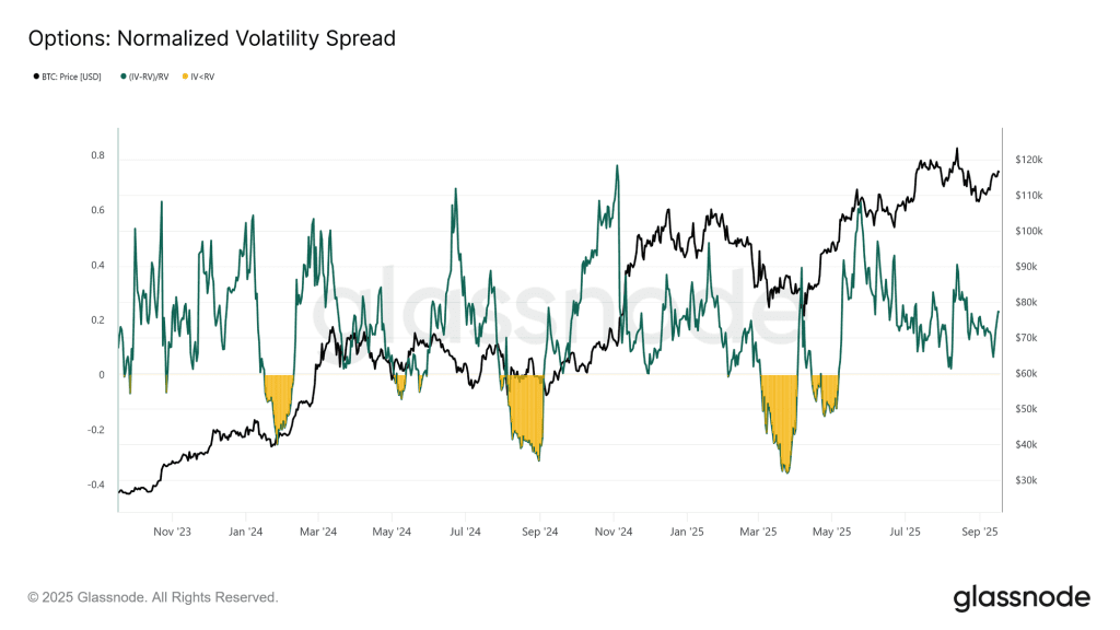 با توجه به نمودار پراکندگی نوسانات، در طول ماه سپتامبر (شهریور) اکثرا نوسانات ضمنی و نوسانات تحققیافته به هم نزدیک بودهاند؛ اما همزمان با جلسه FOMC، نوسانات ضمنی افزایش یافته است؛ چون بازارسازها ریسک خود را دوباره قیمتگذاری کردهاند و تریدرها به سراغ موقعیت لانگ گاما (Long Gamma) رفتهاند. در حال حاضر، پراکندگی نوسانات آپشن ۰.۲۲۸ است؛ یعنی کمی بالاتر از حد نرمال خود. این یعنی فروشندگان موقعیت لانگ گاما، پریمیوم یا هزینه بیشتری میگیرند و این روشی برای کسب درآمد از یک بازار کمنوسان است.