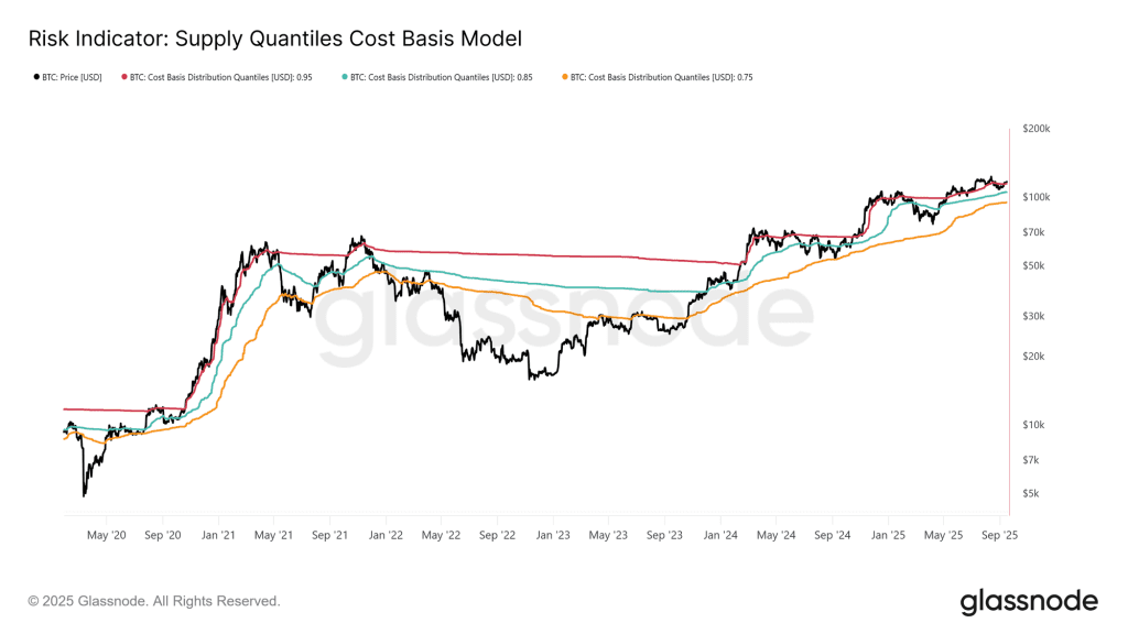 پس از جلسه FOMC، بیت کوین تا ۱۱۷,۲۰۰ دلار رشد کرد و این باعث شد که بخش زیادی از عرضه بیت کوین دوباره در سود قرار بگیرد. در حال حاضر قیمت بیت کوین کمی کاهش یافته و در نزدیکی ۱۱۵,۷۰۰ دلار معامله میشود. طبق شاخص توزیع قیمت خرید سرمایهگذاران بر اساس صدکهای عرضه (The Supply Quantiles Cost Basis model)، قیمت خرید ۹۵٪ از عرضه در گردش بیت کوین (صدک ۰.۹۵) ۱۱۵,۲۰۰ دلار است و بیت کوین کمی بالاتر از این سطح معامله میشود. حفظ این محدوده برای بیت کوین بسیار مهم است و باعث تداوم تقاضا میشود. اما اگر این حمایت شکسته شود، ممکن است بیت کوین به قیمت خرید صدک ۸۵٪ تا ۹۵٪، یعنی محدوده ۱۰۵,۵۰۰ تا ۱۱۵,۲۰۰ دلار سقوط کند که احتمال کاهش تقاضا و افزایش فشار فروش در آن زیاد است.