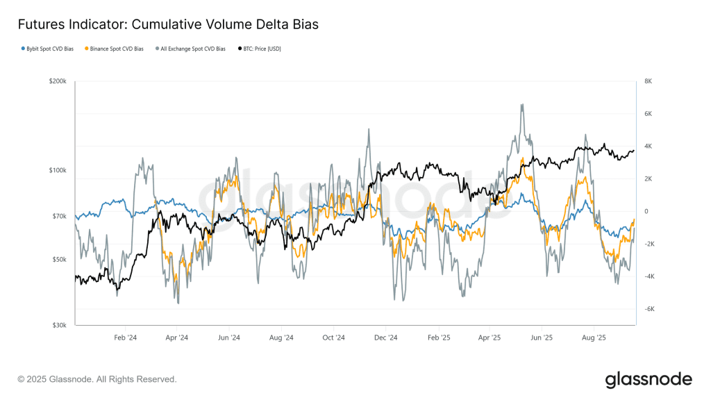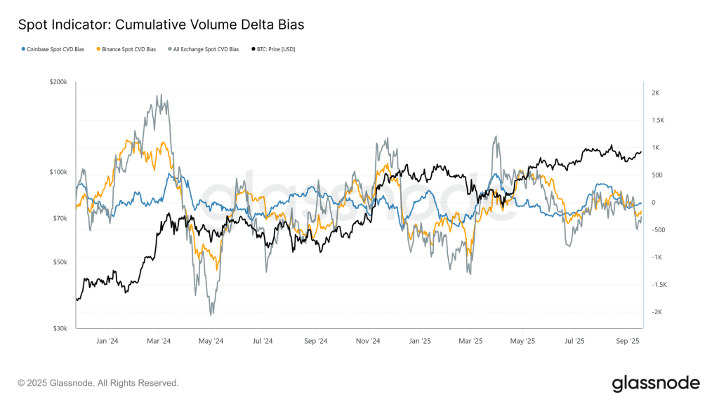 در طول ماه سپتامبر (شهریور) بیت کوین در نزدیکی ۱۰۷,۸۰۰ دلار تثبیت شد که در واقع قیمت خرید هولدرهای کوتاهمدت محسوب میشود. در این مدت ساختار بازار از حالت متعادل به سلطه فروشندگان متمایل شده است که در شاخص دلتای تجمعی حجم (CVD) بهوضوح قابل مشاهده است. انحراف خط این شاخص از میانه ۹۰ روزه خود، سوگیری بازار به سمت فروشندگان را نشان میدهد.