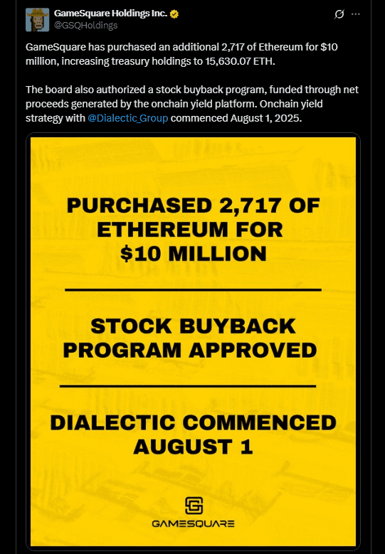 شرکت GameSquare مجموع داراییهای ETH خود را به بیش از ۱۵٬۶۳۰ عدد رساند. همچنین هیئتمدیره این شرکت برنامه بازخرید سهام را با استفاده از سود حاصل از پلتفرمهای درآمدزای زنجیرهای تصویب کرده است.