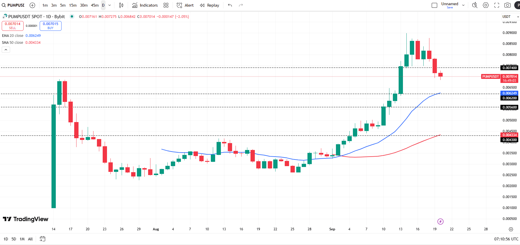 به گزارش بیاین کرپیتو، قیمت پامپ فان پس از یک دوره رنج و تثبیت، از اوایل سپتامبر (شهریور) وارد یک روند صعودی پرقدرت شد و توانست تا محدودهی ۰.۰۰۸۹ دلار رشد کند. با این حال، در روزهای اخیر شاهد اصلاح قیمت و تشکیل چند کندل نزولی متوالی هستیم.