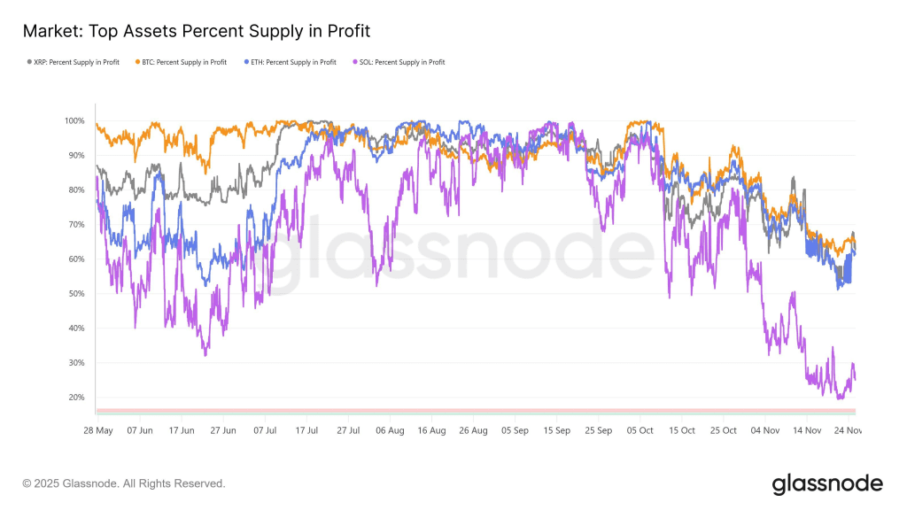 داده‌های «درصد عرضه در سود» گلس‌نود برای ETH، XRP و SOL از ماه اکتبر (مهر) کاهش مستمری را نشان می‌دهد.