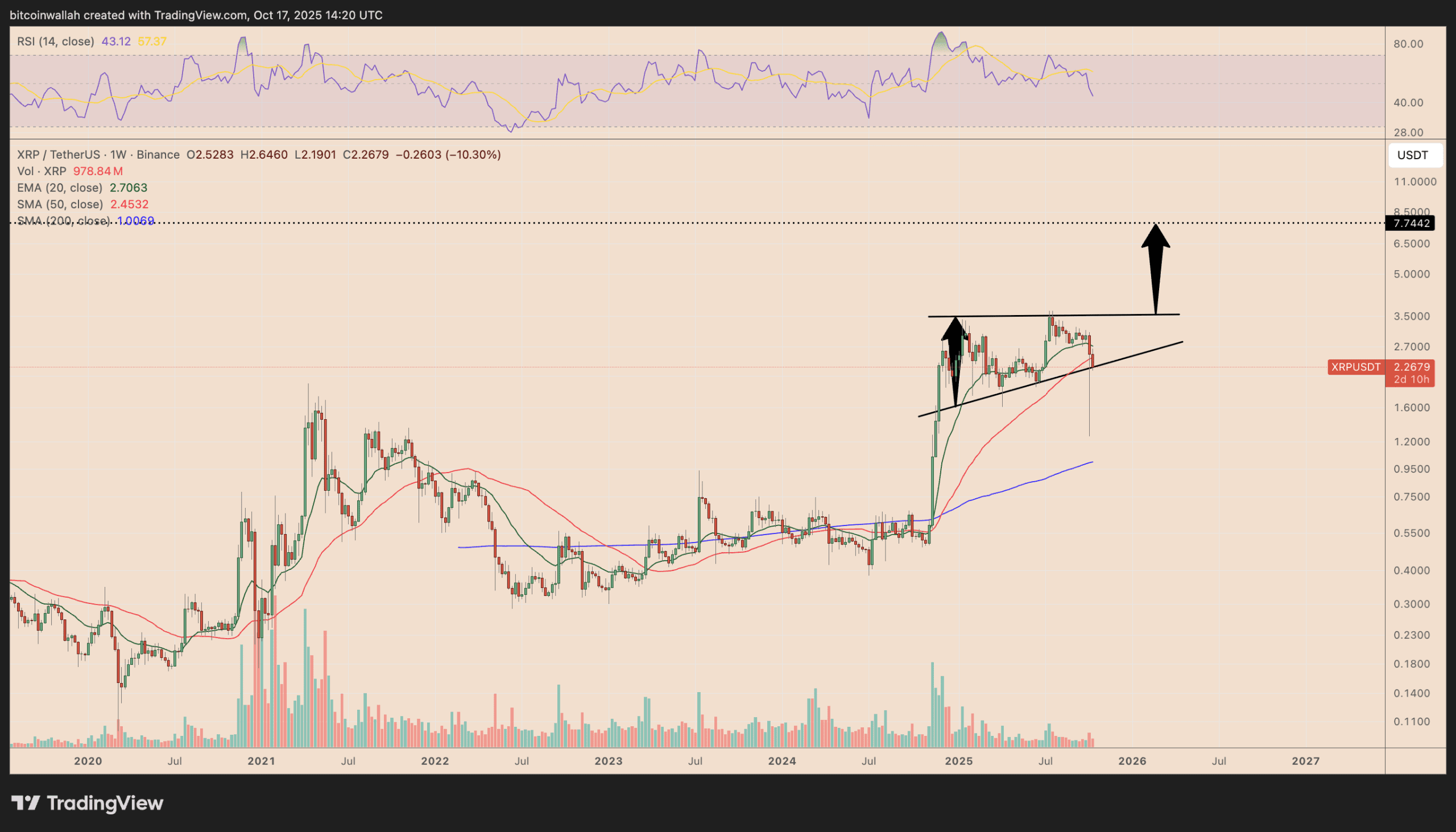 در نمودارهای بلندمدت، XRP سناریوی شکست مثلث صعودی خود را حفظ کرده است. این ارز دیجیتال بالای خط روند پایینی مثلث مذکور نزدیک به ۲.۲۵ دلار باقی مانده است.