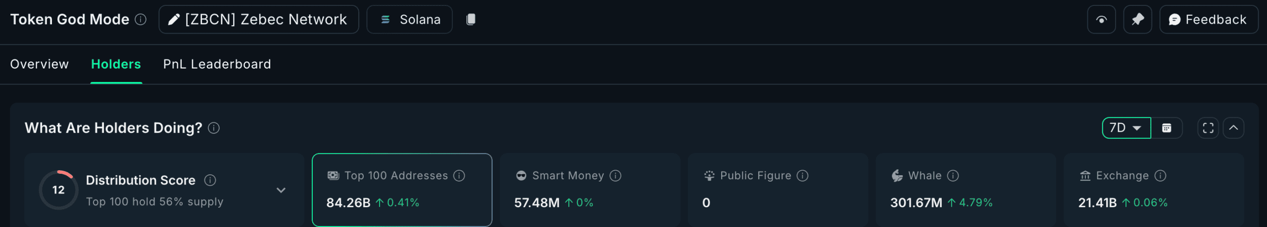 نهنگ‌ها اخیراً دوباره وارد بازار ZBCN شدند. در ۷ روز گذشته، هولدرهای بزرگ ذخایر خود را ۴.۷۹ درصد افزایش دادند و به حدود ۳۰۱.۶۷ میلیون ZBCN رساندند. در نتیجه آن‌ها حدود ۱۳.۸ میلیون توکن اضافه کردند.