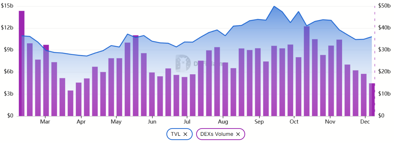 کل ارزش قفل‌شده (TVL) سولانا از ۱۳.۳ میلیارد دلار در دو ماه پیش به ۱۰.۸ میلیارد دلار کاهش یافت. چندین پروژه برتر آن از جمله کامینو، ژوپیتر، جیتو و دریفت، کاهش حداقل ۲۰ درصدی را در سپرده‌‌گذازی تجربه کردند. علاوه بر این فشار، فعالیت معاملاتی در صرافی‌های غیرمتمرکز (DEX) سولانا نیز به‌شدت کاهش یافت.