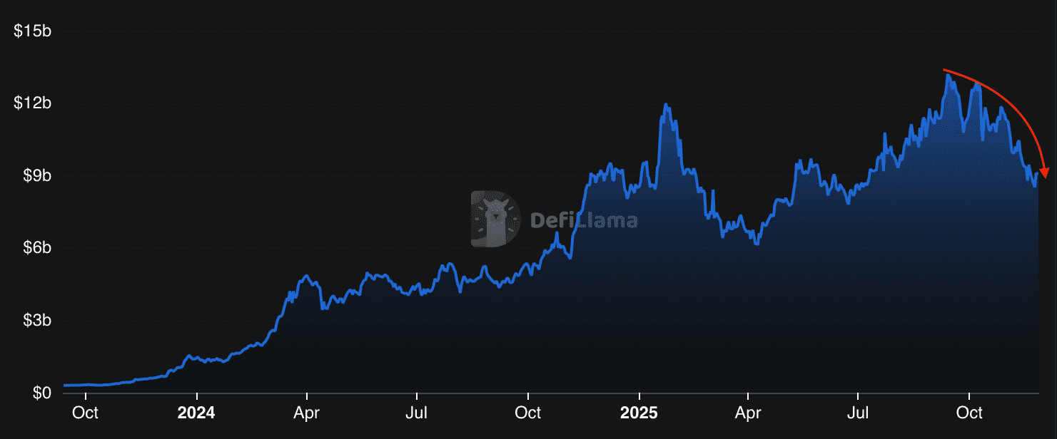 به همین ترتیب، ارزش کل سرمایه قفلشده (TVL) سولانا ۲۰ درصد در ماه جاری کاهش یافته و از اوج ۱۳.۲۳ میلیارد دلاری خود در سپتامبر تا ۹.۱ میلیارد دلار ۳۲ درصد افت داشته است.