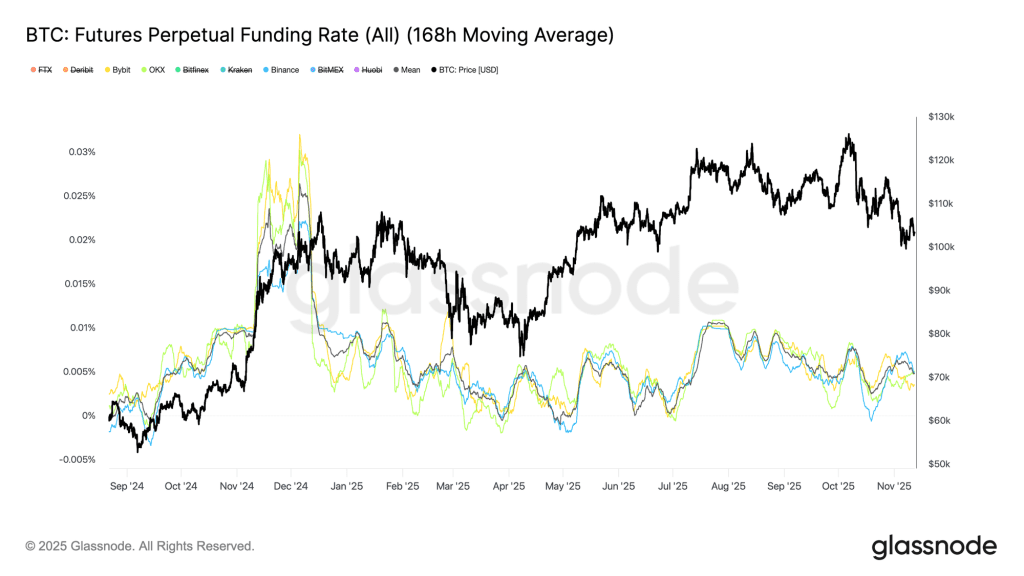 فاندینگ ریت بازار پرپچوال (دائمی) بیت کوین در بیشتر صرافیهای بزرگ کاهش یافته که نشاندهنده کاهش ریسکپذیری و تمایل سرمایهگذاران به معاملات اهرمی است. از زمان رویداد پاکسازی گسترده اهرم که در ماه اکتبر (مهر) رخ داد، فاندینگ ریت و اوپن اینترست بازار آتی بیت کوین همزمان کاهش یافته است. این موضوع نشان میدهد که معاملهگران محتاط هستند و فعلا دست به معاملات پرریسک نمیزنند.
