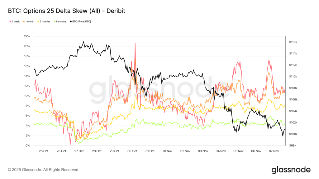 در حال حاضر نبود یک محرک یا کاتالیست صعودی، امکان تغییر انحراف نوسانات (Skew) به نفع قراردادهای کال را محدود کرده است. بازار آپشن در حال قیمتگذاری (پرایس کردن) سقوط قیمت بیت کوین به زیر حمایت ۱۰۰,۰۰۰ دلار است. باید ببینیم که بازار آپشن در هفتههای آینده چگونه به این اتفاق واکنش نشان خواهد داد.
