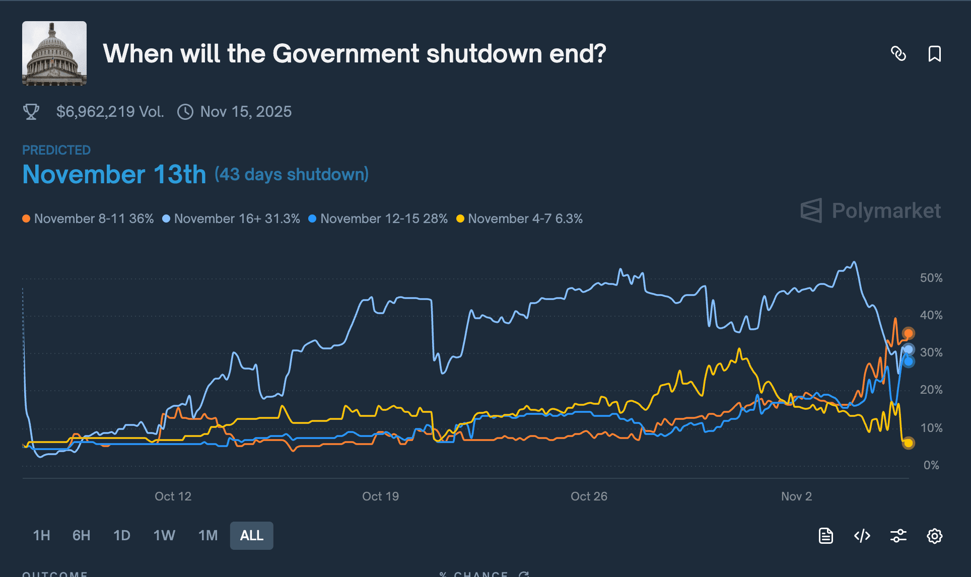 خبر خوب برای گاوهای بازار (خریداران) این است که احتمال پایان زودهنگام تعطیلی افزایش یافته است. بر اساس دادههای سایت پیشبینی Polymarket، معاملهگران بیشتری روی حل این بحران در هفته آینده امیدوار هستند. بهطور مثال، احتمال پایان تعطیلی بین ۸ تا ۱۱ نوامبر از ۲۲ درصد به ۳۶ درصد افزایش یافته و بازه ۱۲ تا ۱۵ نوامبر نیز از ۱۷ به ۲۸ درصد رسیده است.
