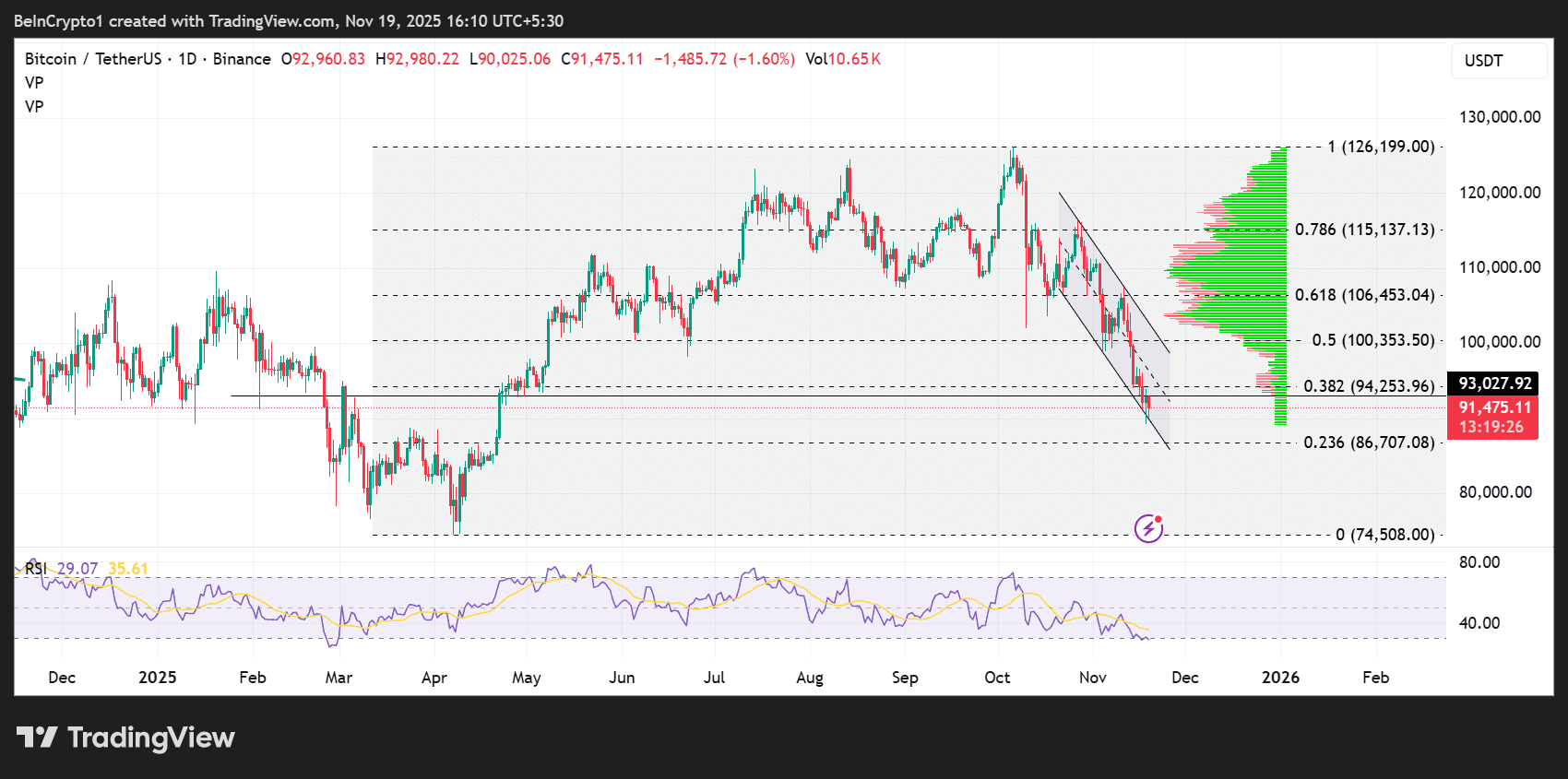علاوه بر این، شاخص RSI نزولی است که نشان میدهد مومنتوم رو به کاهش است و این موضوع شانس را بیشتر به نفع خرسها متمایل میکند. اگر خرسها موفق شوند، قیمت بیت کوین میتواند تا ۸۶٬۷۰۰ دلار کاهش یابد. سطحی که با ۲۳.۶ درصد فیبوناچی مشخص شده است.