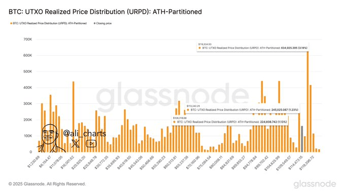 یک دیوار مقاومتی بزرگ در محدوده ۱۱۷٬۰۰۰ دلار وجود داشت و در پایین یک گپ دیده میشد. [بیت کوین به بالای ۱۲۰٬۰۰۰ دلار رسیده ولی] بین ۱۱۳٬۰۰۰ تا ۱۰۸٬۰۰۰ دلار حمایت خیلی محکمی هنوز وجود ندارد.