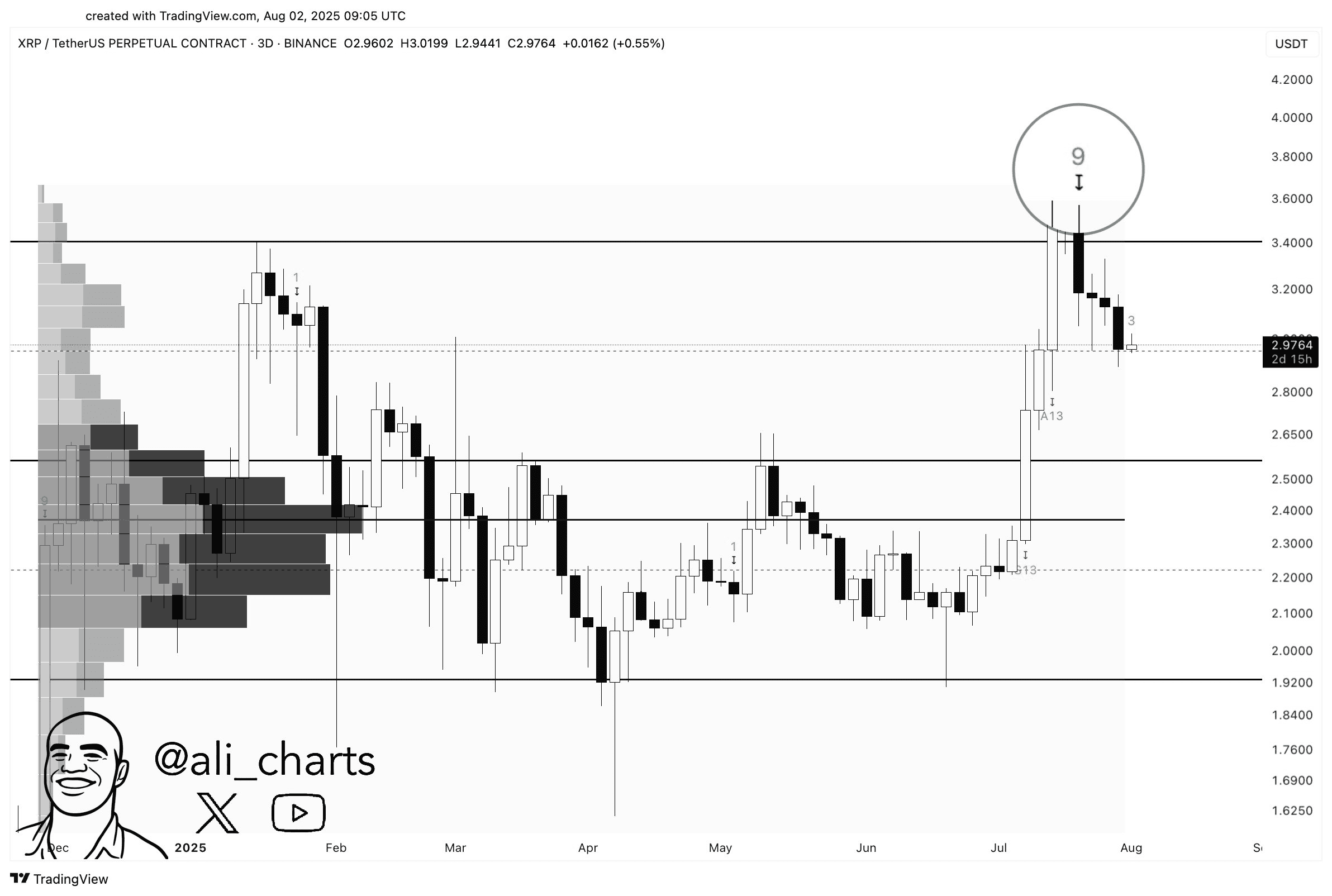 سومین ارز مورد بررسی علی مارتینز، ریپل (XRP) است. به گفته مارتینز، بر اساس شاخصها و دادههای مختلف قیمت ریپل ممکن است روند سختی شود. او به شاخص تکنیکال تام دیمارک (TD Sequential) اشاره میکند که برای شناسایی احتمال پایان روند و نقاط بازگشت قیمت استفاده میشود و اکنون روی نمودار سه روزه ریپل سیگنال فروش داده است.