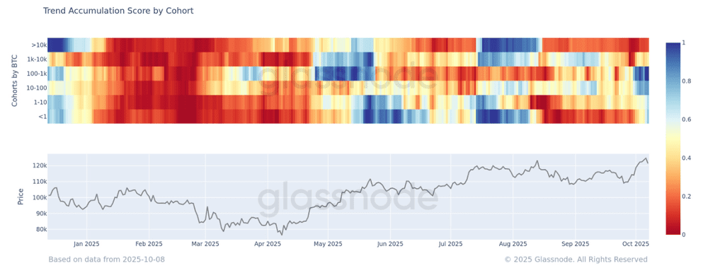 طبق آخرین داده‌های شاخص نمره روند انباشت بیت کوین، هولدرهای کوچک و متوسط (با موجودی ۱ تا ۱۰۰۰ بیت کوین) در طول چند هفته‌های اخیر مقدار قابل توجهی بیت کوین خریده‌اند. در واقع تعادل بازار به سمت خریداران است و فروش از سمت نهنگ‌ها در مقایسه با اوایل سال ۲۰۲۵، تا حد زیادی کاهش یافته است.