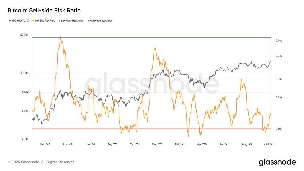 حالا که بیت کوین وارد یک فاز کشف قیمت جدید شده است، برای ارزیابی قدرت و پایداری رالی فعلی مهم است که میزان سیو سود از سمت سرمایه‌گذاران را بررسی کنیم. یکی از شاخص‌های پرکاربرد در این زمینه، شاخص نسبت ریسک سمت فروش (Sell-Side Risk Ratio) است که ارزش دلاری سود و ضرر نقدشده بازار بیت کوین را نسبت به کل ارزش بازار تحقق‌یافته این بازار اندازه می‌گیرد. در واقع، این شاخص به ما نشان می‌دهد که سرمایه‌گذاران چقدر تمایل دارند بیت کوین‌های خود را بفروشند.