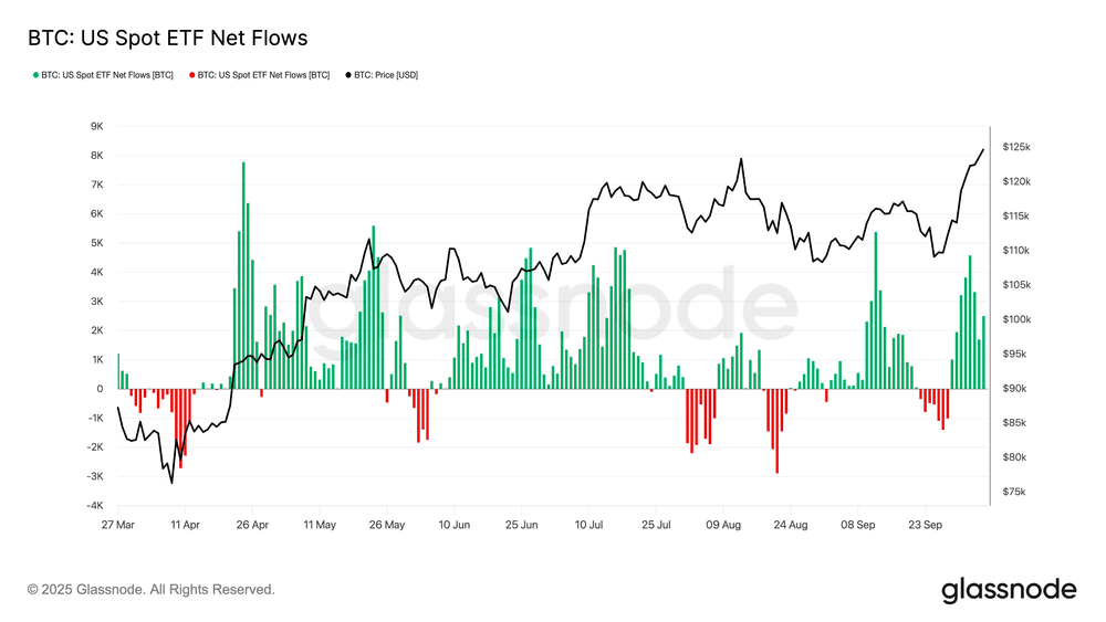 پس از دوره بازخرید (خروج سرمایه از ETF) که در ماه سپتامبر (شهریور) در جریان بود، تنها در عرض یک هفته بیش از ۲.۲ میلیارد دلار سرمایه وارد ETFهای بیت کوین شد و این یکی از بزرگ‌ترین موج‌های خرید بیت کوین از ماه آوریل (فروردین) تا به الان بود. تقاضا از سمت سرمایه‌گذاران نهادی عرضه بازار اسپات بیت کوین را به‌کلی جذب کرد و نقدینگی کل بازار را تقویت کرد. طبق تاریخچه بیت کوین، معمولا سه‌ماهه چهارم هر سال از نظر عملکرد بهترین فصل بیت کوین است؛ چون اغلب در این فصل ریسک‌پذیری و تمایل سرمایه‌گذاران به متعادل‌سازی پورتفولیو و سرمایه‌گذاری مجدد بیشتر می‌شود.