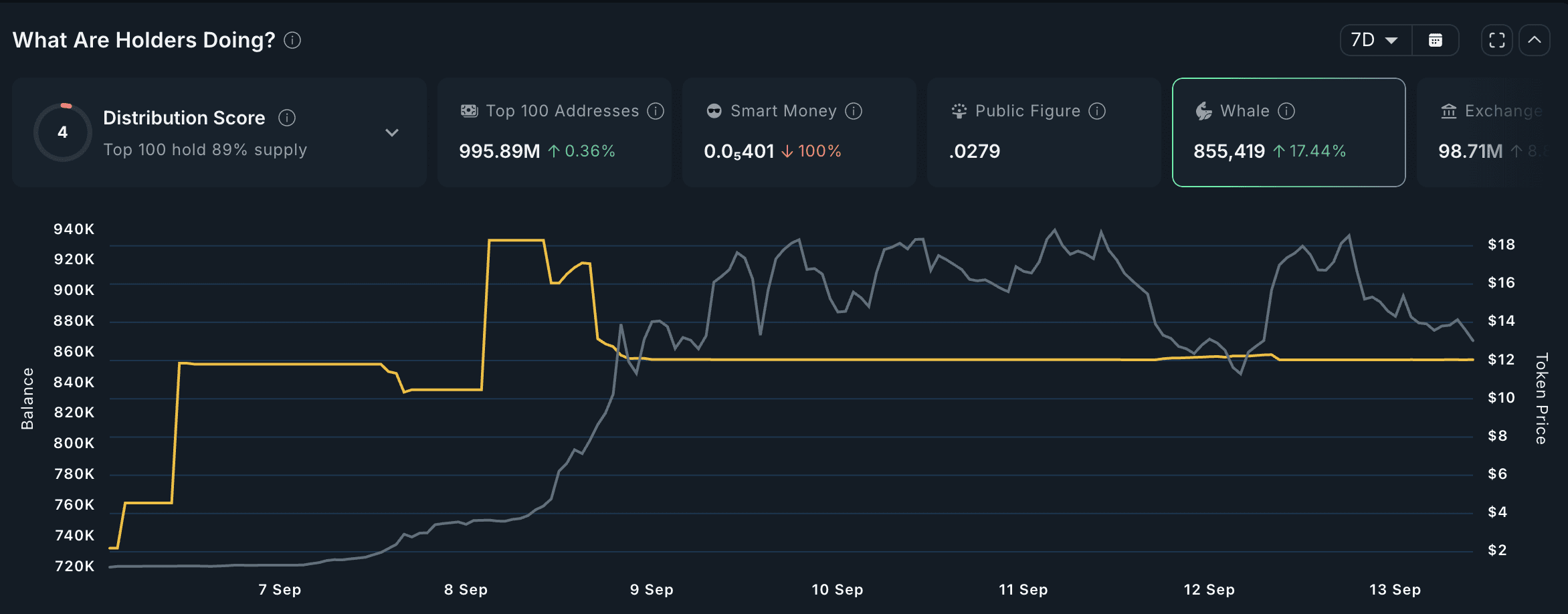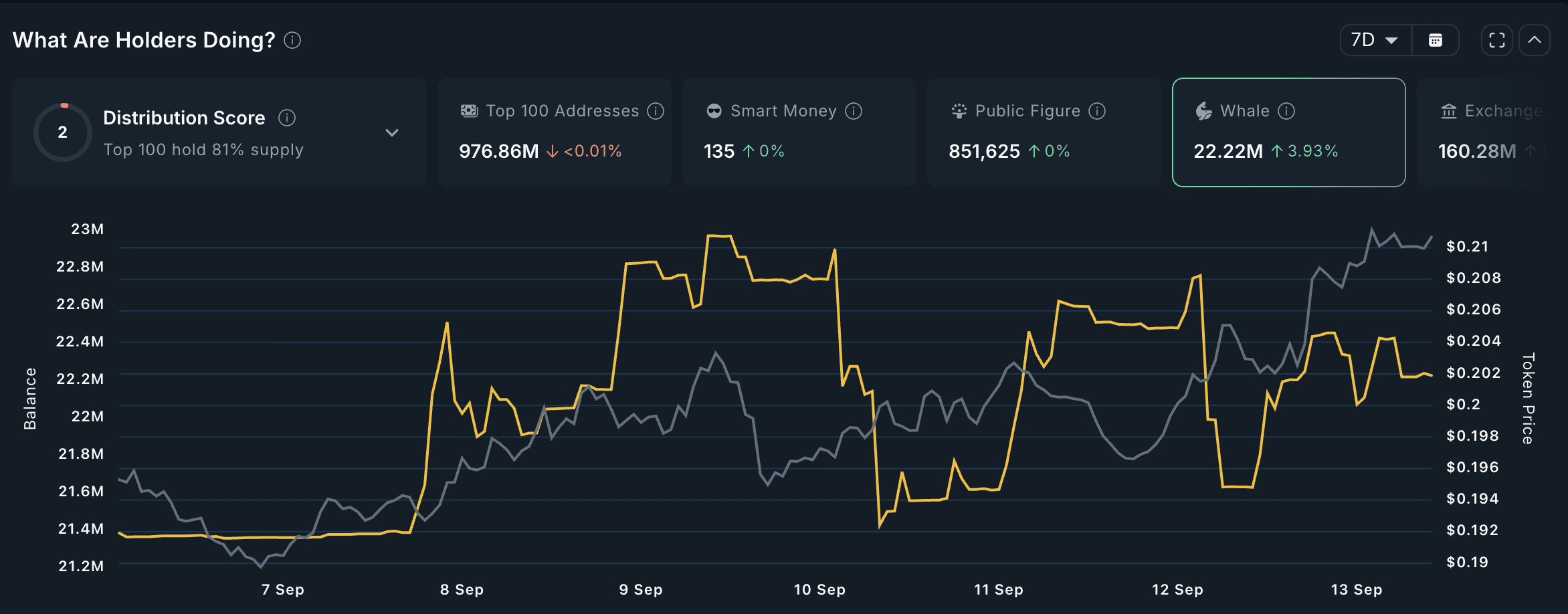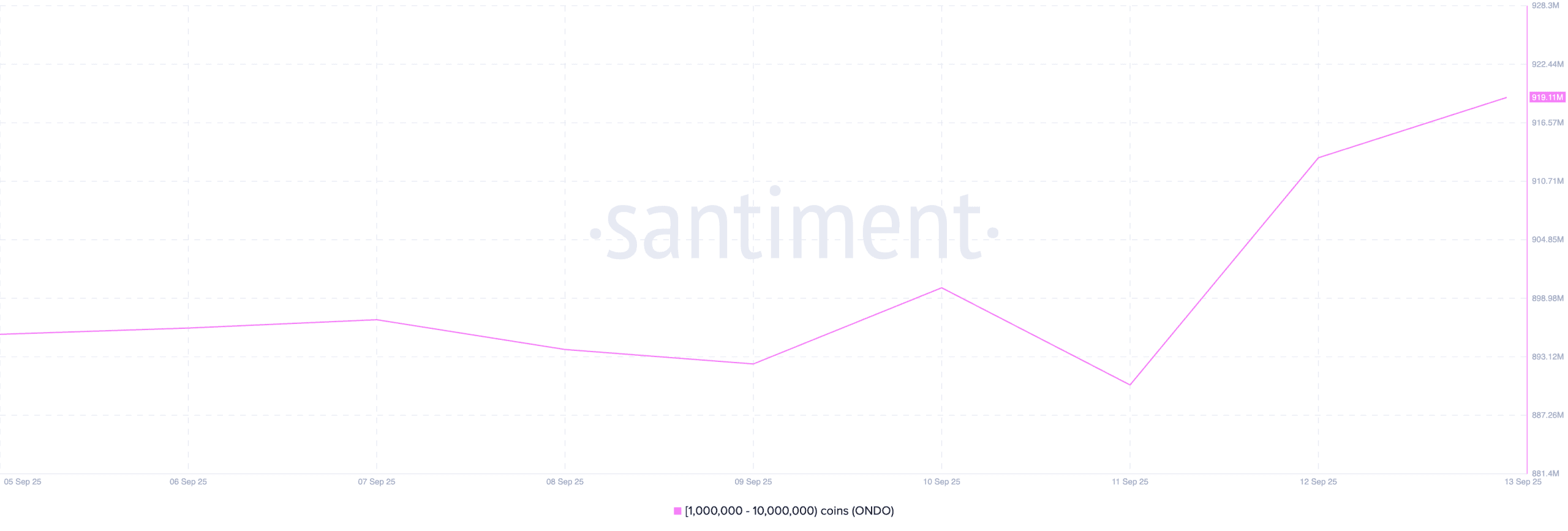توکن اوندو یکی از انتخاب‌های برتر نهنگ‌ها در هفته قبل بود. داده‌های آن‌ چین نشان می‌دهد از ۵ سپتامبر تاکنون، هولدرهای بزرگ با کیف‌ پول‌هایی حاوی بین ۱ تا ۱۰ میلیون ONDO در مجموع ۲۳.۷۳ میلیون توکن انباشت کرده‌اند.