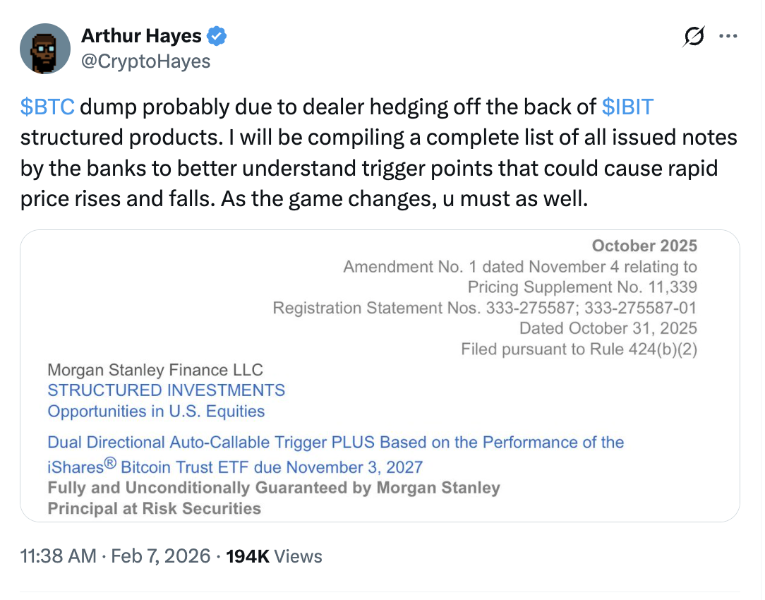 این‌ها محصولات مالی پیچیده‌ای هستند که بانک‌ها در آن‌ها به مشتریانشان معاملاتی را بر روی بیت کوین ارائه می‌دهند. هنگامی که BTC به شدت سقوط می‌کند و از سطوح کلیدی مانند ۷۸,۷۰۰ دلار در یکی از محصولات مورگان استنلی عبور می‌کند، معامله‌گران باید با فروش BTC پایه یا قراردادهای آتی، دلتا-هج کنند.