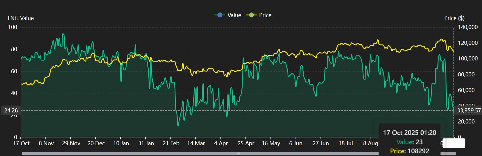 داده‌های Coinperps نشان می‌دهد که احساسات بازار به شدت به سمت ترس بازگشته است. این سطح آخرین بار در آوریل (فروردین) مشاهده‌ شده‌ بود و در آن زمان بیت‌ کوین زیر ۸۰,۰۰۰ دلار معامله می‌شد.