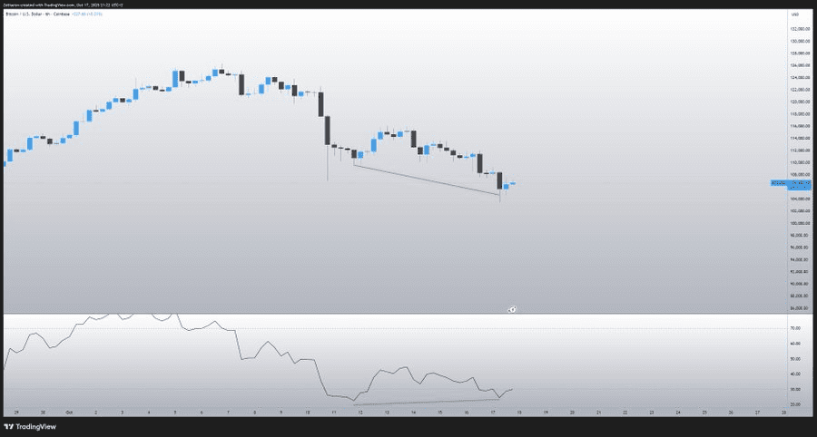 در حالی که قیمت به کفهای جدید رسید، RSI به دنبال یک کف بالاتر بود که نشان میدهد فشار فروش در زیر ۱۱۰,۰۰۰ دلار در حال کاهش است.