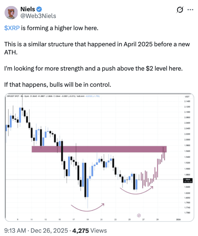 ریپل در حال تشکیل کفهای بالاتر است. مشابه این ساختار در آوریل ۲۰۲۵ قبل از رسیدن به اوج قیمت جدید اتفاق افتاد. من منتظر قدرت بیشتر و جهشی بالای سطح ۲ دلار هستم. اگر این اتفاق بیفتد، خریداران کنترل بازار را به دست خواهند گرفت.