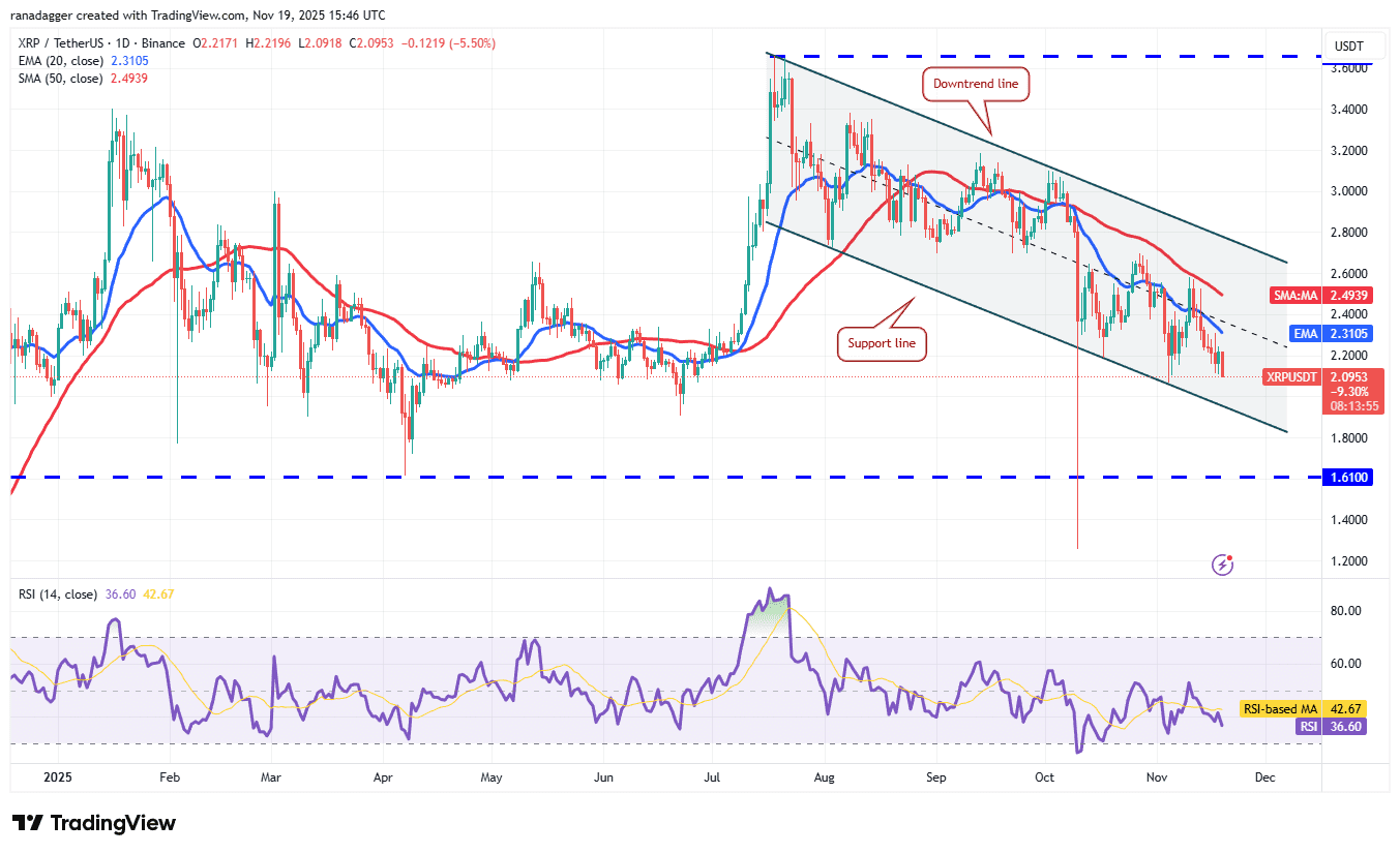 فروشندگان تلاش خواهند کرد تا ریپل (XRP/USDT) را به خط حمایت الگوی کانال نزولی موجود در نمودار یک روزه برسانند.