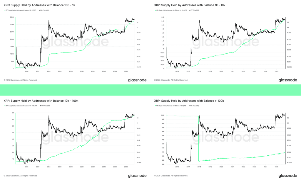 داده‌های آنچین نیز از چشم‌انداز صعودی حمایت می‌کنند. طبق گزارشات، موجودی XRP در میان کیف پول‌هایی که بیش از ۱۰۰ واحد XRP نگهداری می‌کنند، طی ماه‌های اخیر و همزمان با فاز تثبیت قیمت، به‌طور پیوسته افزایش یافته است.