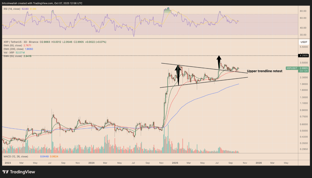 از دیدگاه تحلیل تکنیکال، XRP اکنون در مرحله شکست از الگوی مثلث متقارن خود قرار دارد. پس از عبور قیمت از خط بالایی مثلث، اکنون در حال بازگشت جزئی برای تست مجدد مقاومت شکسته‌شده است.