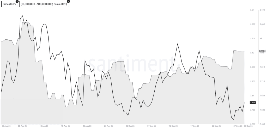 نهنگهای XRP همچنان به ادامه رشد امیدوار هستند و از اصلاح اخیر برای انباشت بیشتر استفاده کردهاند. طبق دادهها، شاخص توزیع عرضه نشان میدهد نهنگهایی که بین ۱۰ تا ۱۰۰ میلیون توکن هولد کردهاند، طی سه روز گذشته بیش از ۱۲۰ میلیون XRP معادل حدود ۳۴۰ میلیون دلار خریداری کردهاند. این گروه اکنون حدود ۸ درصد از کل عرضه در گردش XRP را در اختیار دارند.