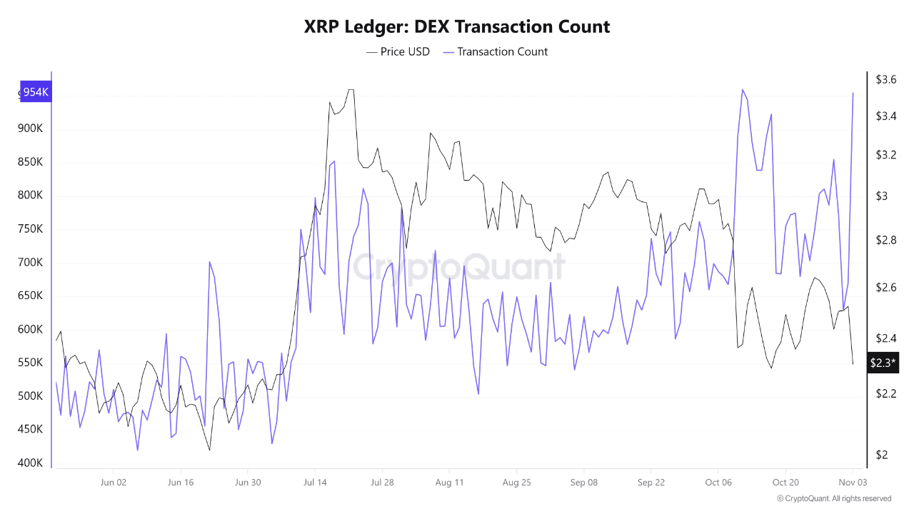 در همین حال، دادههای CryptoQuant نشان میدهد که صرافی غیرمتمرکز بومی شبکه XRP شاهد ۹۵۴٬۰۰۰ تراکنش در یک روز بوده بالاترین رقم طی ماههای اخیر.
