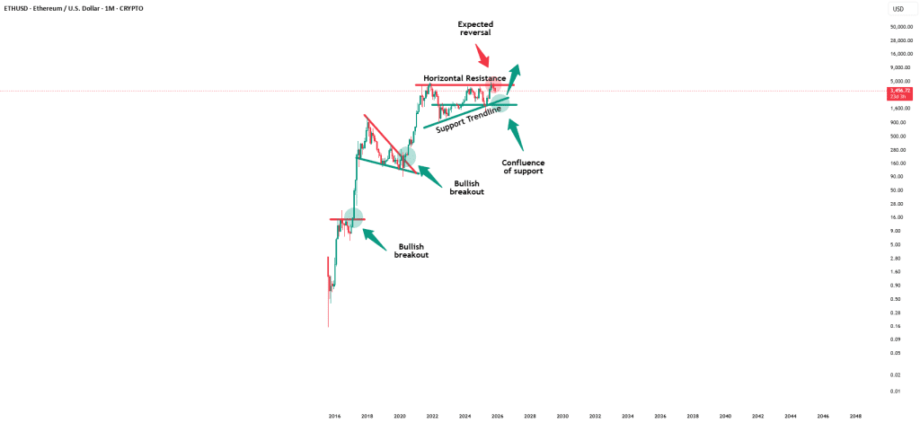 > تو چند ماه اخیر، اتریوم نتونست یه سقف قیمتی جدید بزنه. برای همین، بالاخره یه برگشت نزولی و یه حرکت بزرگ به سمت پایین رو تو آینده می‌بینیم. البته مثلث صعودی هنوز معتبره، پس اون موقع یه فرصت عالی برای خریده.