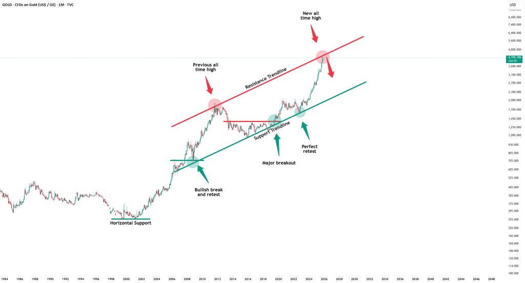 > سال ۲۰۱۹، طلا تشکیل کف گرد خودش رو تأیید کرد. این شکست بعدش با یه رالی بزرگ حدود ۲۰۰% توی چند سال گذشته همراه شد. اما الان، طلا داره یه خط روند مقاومت اصلی رو دوباره تست می‌کنه و به همین خاطر روند صعودیش تموم میشه.