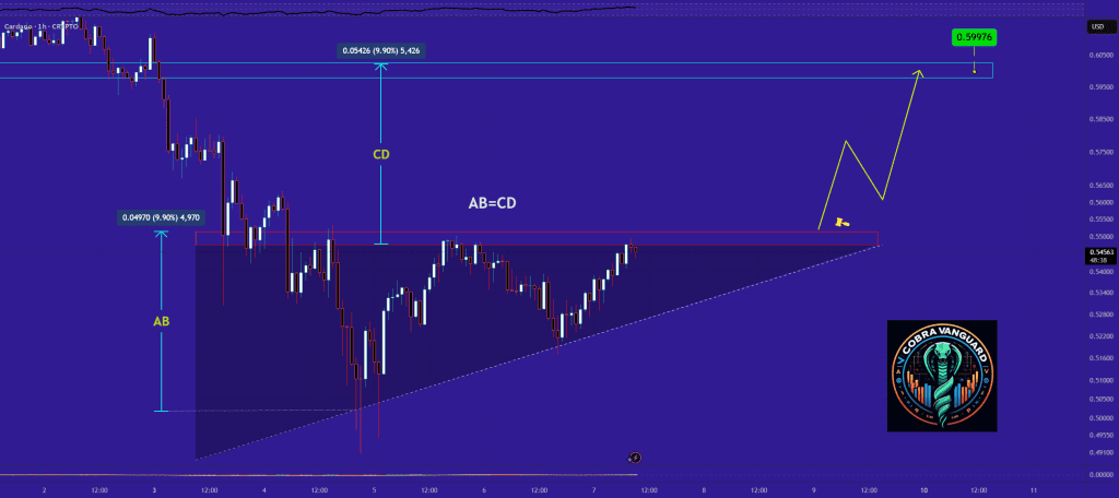 قیمت کاردانو توی تایم‌فریم ۱ ساعته داره یه الگوی مثلث صعودی تشکیل میده.