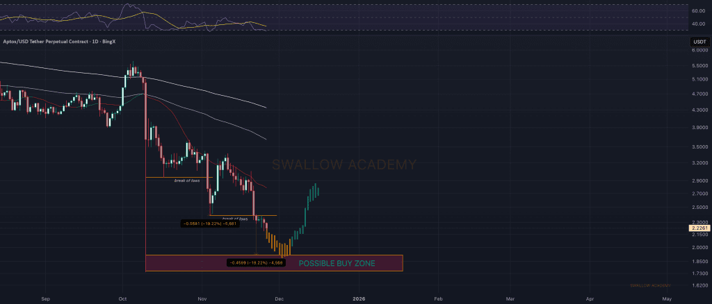 APT هنوز تو تایمفریمهای بالا ضعیف به نظر میرسه، قیمت داره پشت سر هم کفهای پایینتر میسازه و هیچ حمایت مشخصی هم تو دید نیست. به خاطر همین، انتظار داریم باز هم افت کنه و منطقه جذب نقدینگی اخیر رو به عنوان ناحیه منطقی بعدی که قیمت ممکنه توش سقوط کنه، زیر نظر داریم.