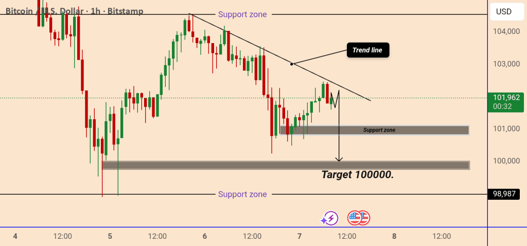 بیت کوین زیر یه خط روند نزولی داره معامله میشه و نزدیک ۱۰۲,۰۰۰ مقاومت داره. قیمت داره محدوده حمایتی ۱۰۱,۰۰۰ رو تست میکنه، با یه هدف نزولی ۱۰۰,۰۰۰ اگه حمایت بشکنه.