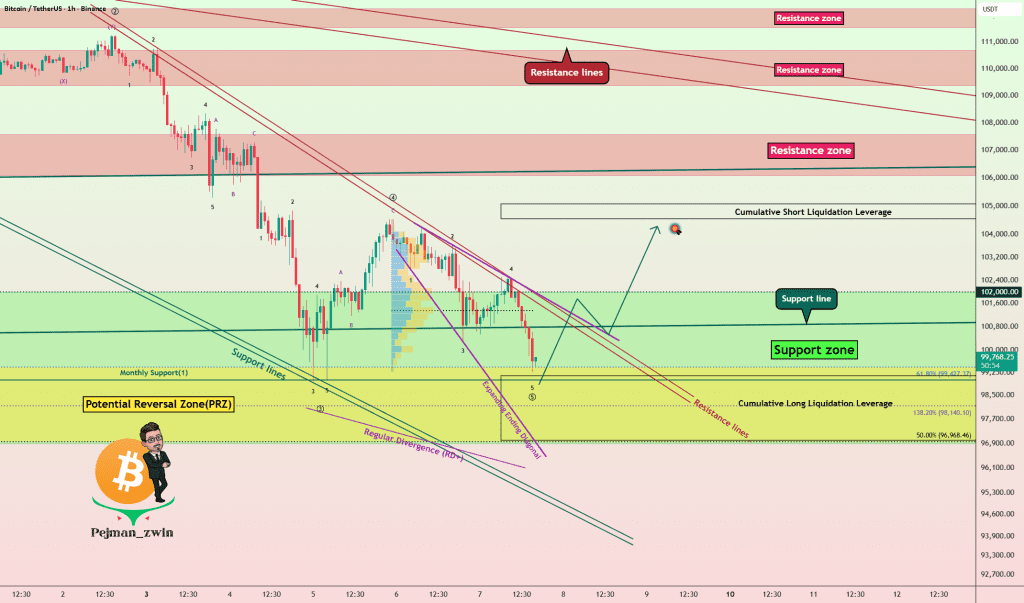در حال حاضر، بیت کوین() داره توی یک ناحیه حمایتی ($۱۰۲۰۰,۹۸۰-$۹۶,۸۸۰) نزدیک به ناحیه برگشتی احتمالی (PRZ) [$97,000-$99,420] و یک اهرم لیکوییدیشن لانگ تجمعی ($۹۹,۱۴۵-$۹۷,۲۰۸) حرکت میکنه.