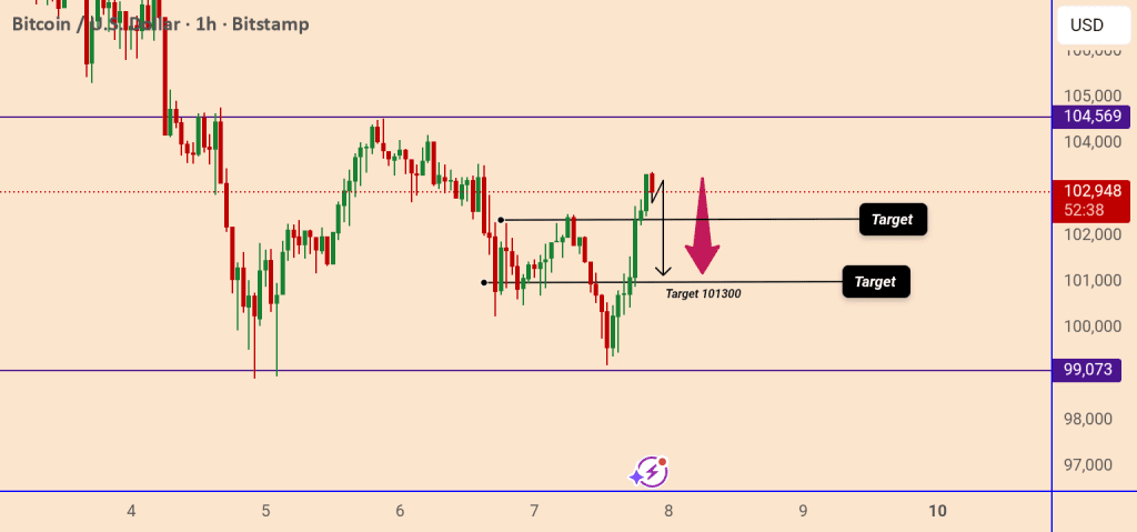 بیت کوین (BTC/USD) داره یه ستاپ نزولی احتمالی حدود سطح ۱۰۳,۰۰۰ نشون میده، با مقاومت نزدیک ۱۰۴,۵۰۰. یه پولبک (اصلاح) انتظار میره که ناحیه حمایت ۱۰۱,۳۰۰ رو هدف قرار بده واسه یه افت کوتاه‌مدت احتمالی.