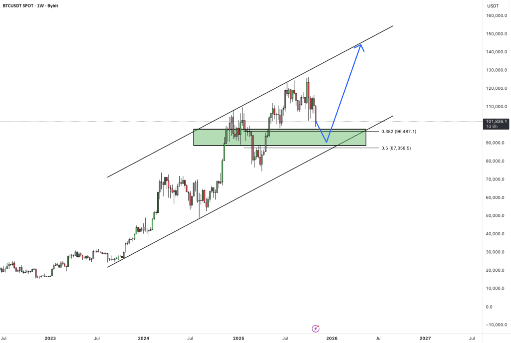 این اصلاح هنوز ادامه داره و قیمت الان داره به یه منطقه حمایت مهم نزدیک میشه که با خط روند صعودی هم‌راستاست.