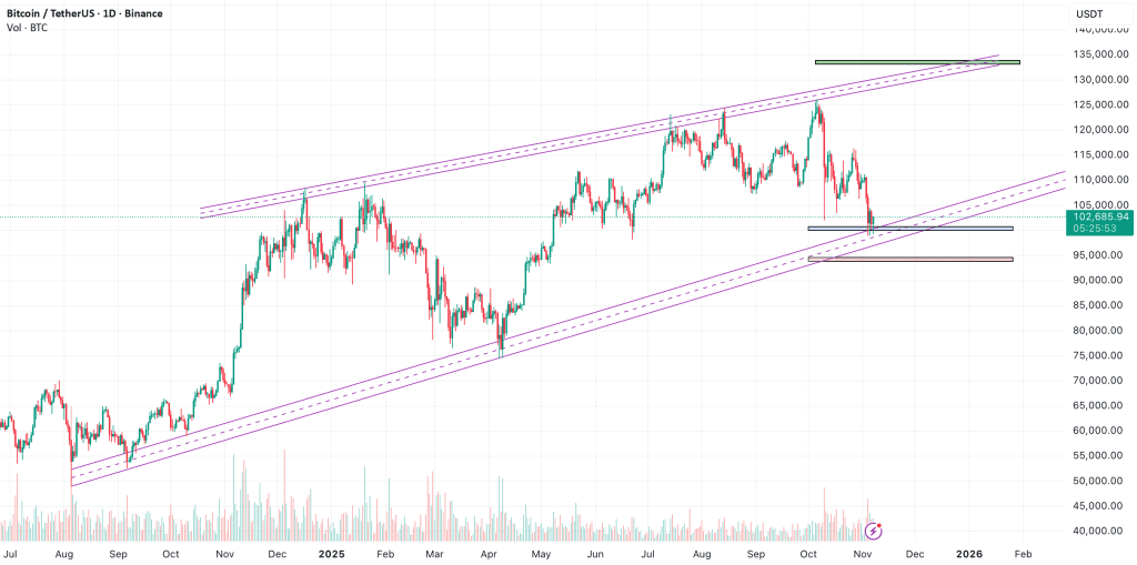 الان به سطح فیب ۰.۵ (آبی) $100k خورده. اگه دوام بیاره، می‌تونه سعی کنه نقدینگی رو تا فیب ۰.۶۱۸ (قرمز) $94K یا گپ CME درست زیر اون $92K (خرس‌ها رو به دام بندازه) جذب کنه و تا فیب ۱.۲۷۲ (سبز) $133K برگرده – بهترین سناریو.
