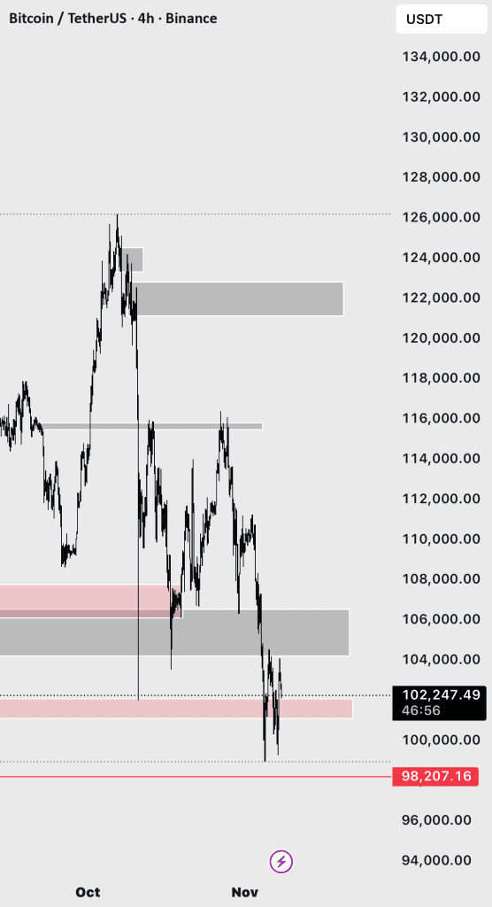 عملکرد قیمت تو این ناحیه، کندل‌های فتیله‌دار (ویک) متعددی رو نشون میده که وارد بلاک تقاضا شدن، این نشونه اینه که فشار فروش داره کم میشه و خریدارها دارن واکنش نشون میدن. از نظر ساختاری، بازار نقدینگی زیر کف‌های قبلی رو جمع کرده و الان داره بالای محدوده روانی ۱۰۰,۰۰۰ تثبیت میشه. این رفتار معمولاً قبل از یه حرکت اصلاحی یا یه برگشت کامل صعودی اتفاق میفته.