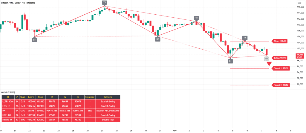 زیر سطح حمایتی ۹۸۷۴۹.۷۷. فقط شکست صعودی ۱۰۴۶۸۵.۲۴ میتونه سناریوی نزولی رو باطل کنه.