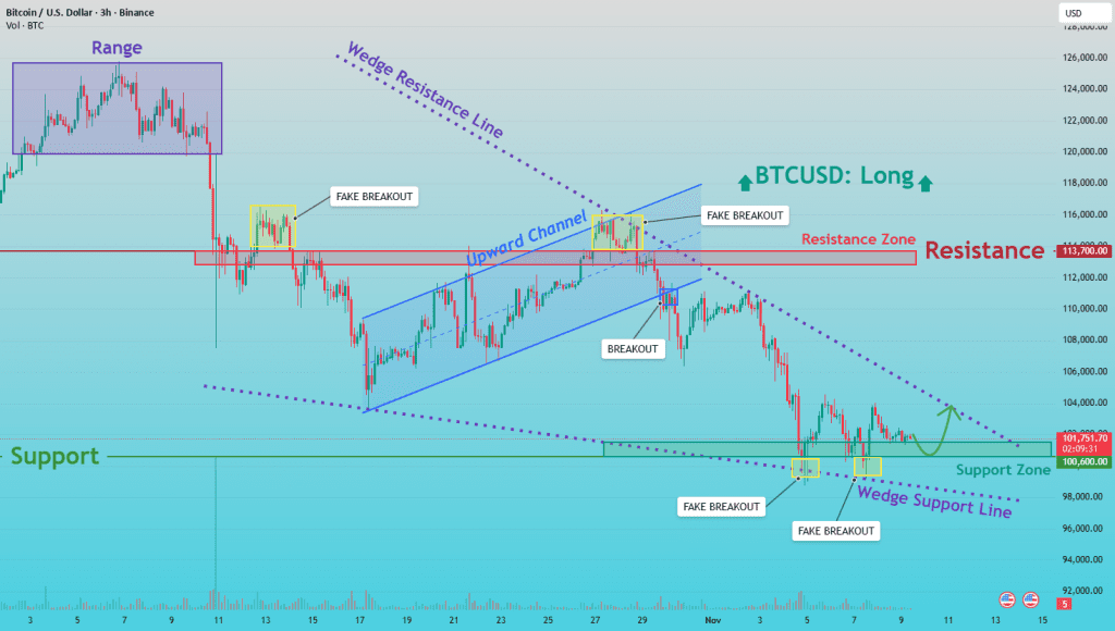 BTCUSD در حال حاضر نشونه‌هایی از یه ریکاوری صعودی بالقوه رو نشون میده. این اتفاق بعد از جهش از محدوده حمایتی کلیدی ۱۰۰,۶۰۰ تا ۱۰۱,۲۰۰ دلار افتاده که با خط حمایت کنج (Wedge Support Line) روی چارت هم راستا هست. این ناحیه بارها در گذشته به عنوان منطقه خریدار عمل کرده و هر بار که تست شده، واکنش‌های قوی رو به بالا رو به دنبال داشته. شکست‌های کاذب اخیر زیر حمایت، نشون‌دهنده جذب نقدینگی و ناتوانی فروشنده‌ها در حفظ روند نزولی هست.